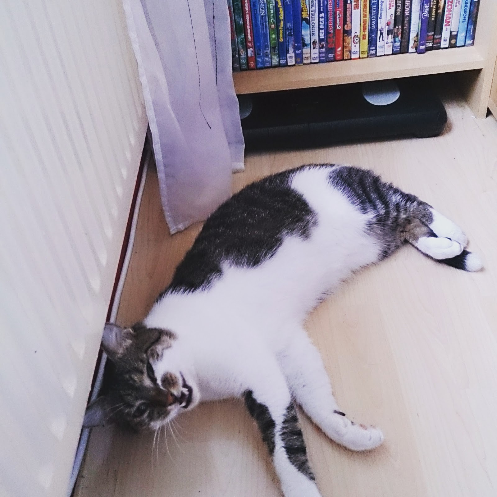 Er hat so schön geschlafen und dann hatte ich ausversehen ein geräusch gemacht und sein blick sah dann so aus. Unsere zwei Katzen sind immer so etwas verrückt. 🙂